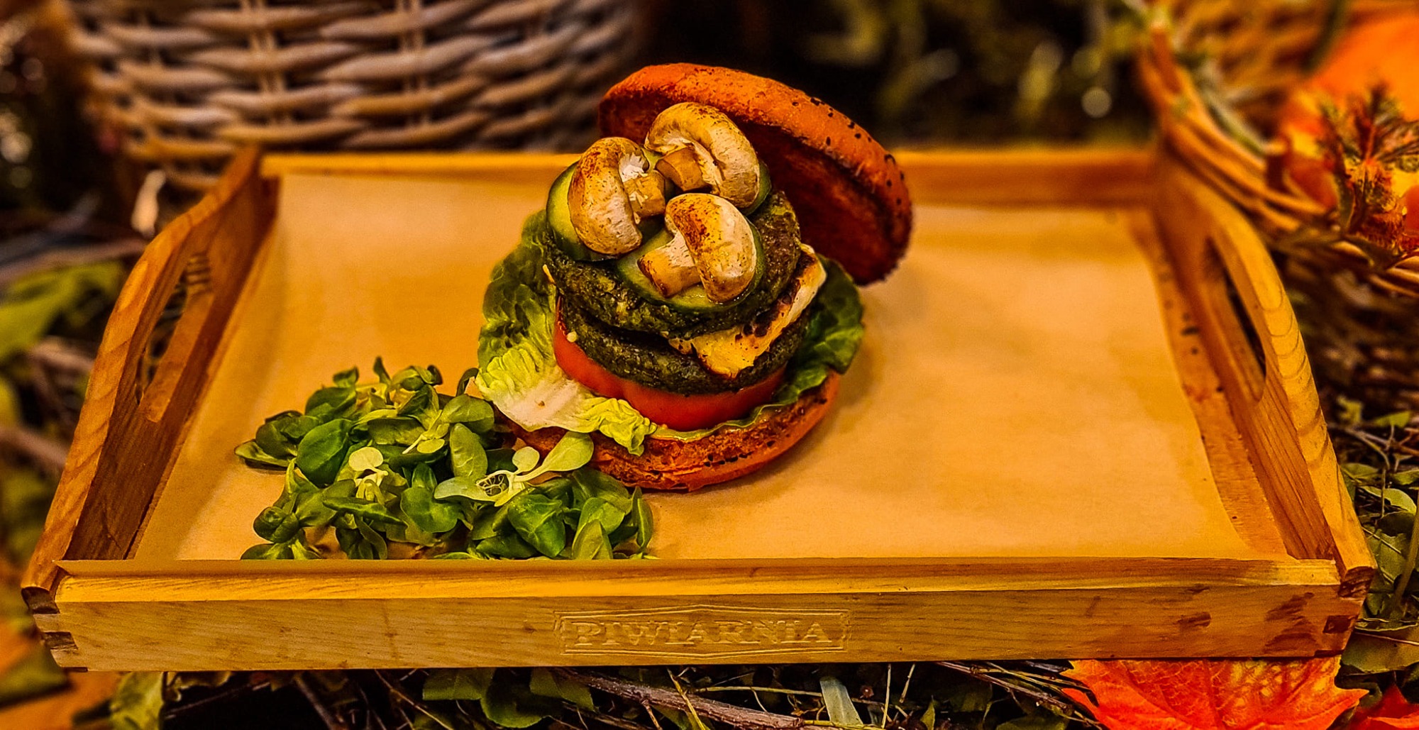 Bułka pszenna, sos firmowy, sałata rzymska, ser smażony, grillowane pieczarki, kotlet wołowy/ pierś, pomidory, cebula czerwona, ogórek konserwowy, jajko sadzone