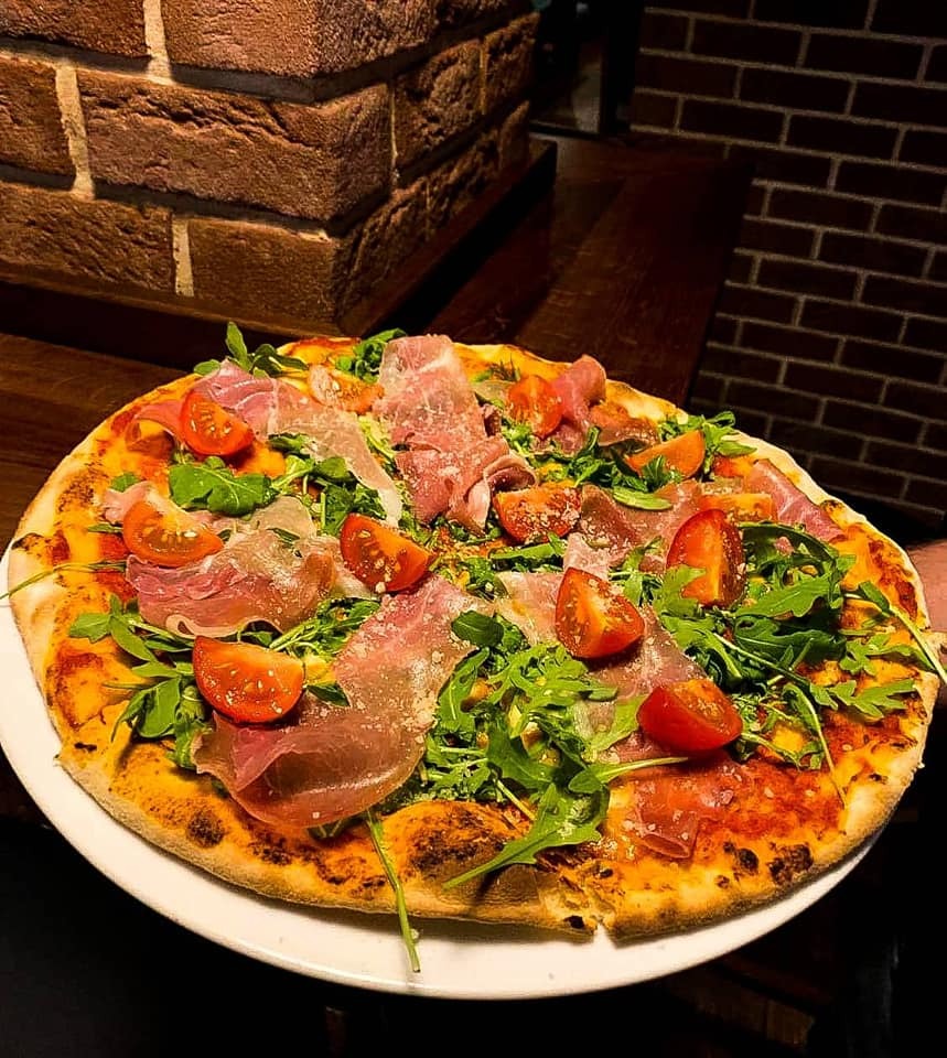 Pizza Margherita, na którą po upieczeniu kładziemy rukolę, pomidorki koktajlowe i szynkę Prosciutto Crudo. Na koniec posypujemy parmezanem sos pomidorowy, ser, rukola, szynka dojrzewająca, parmezan, pomidorki koktajlowe -
