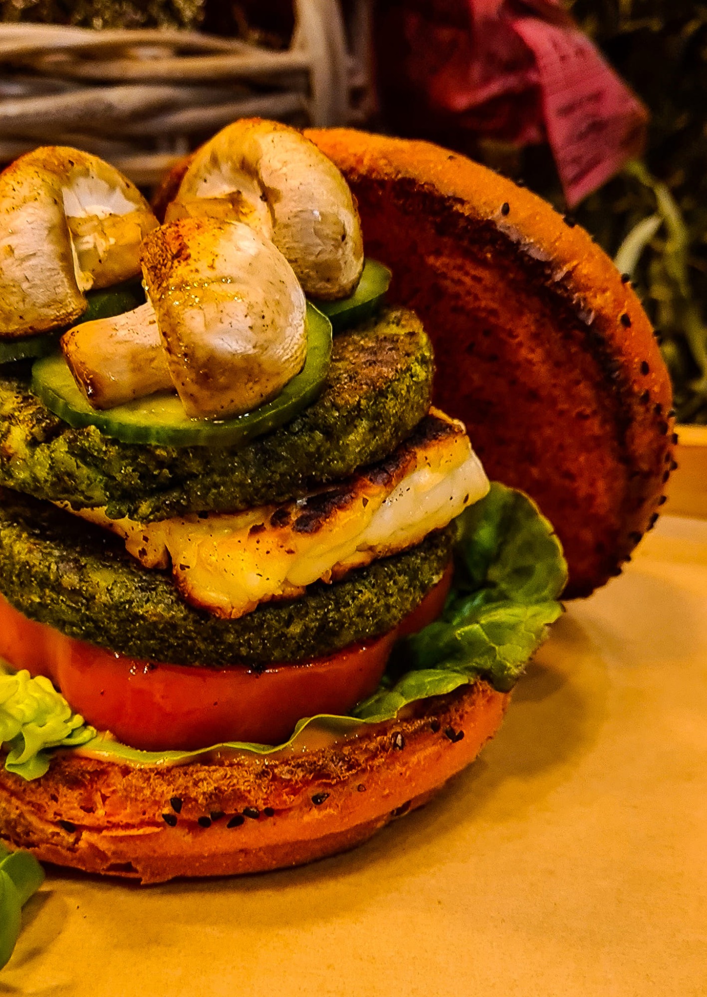 bułka pszenna z pieczonym kawałkiem sera halloumi, sałatą, pomidorem, czerwoną cebulą, ogórkiem zielonym, ogórkiem konserwowym i sosem firmowym, podawany z grubymi frytkami oraz sosem czosnkowym -