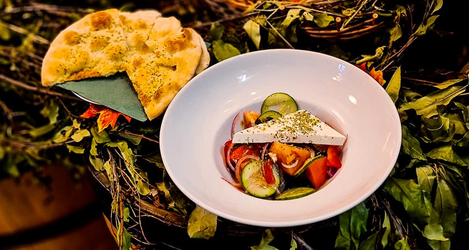z pomidorem, ogórkiem zielonym, cebulą czerwoną, oliwkami czarnymi, serem typu fety, oliwą z oliwek, octem winnym, oregano, sól pieprz, podawane z podpłomykiem -